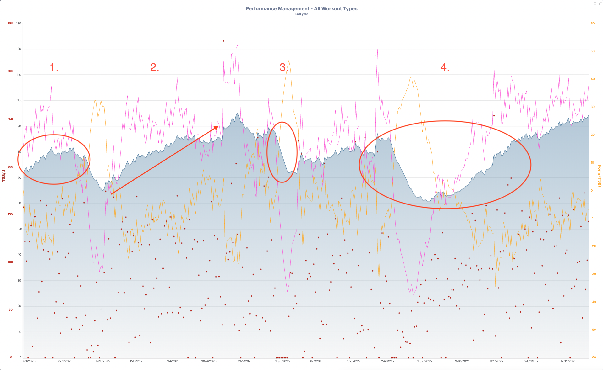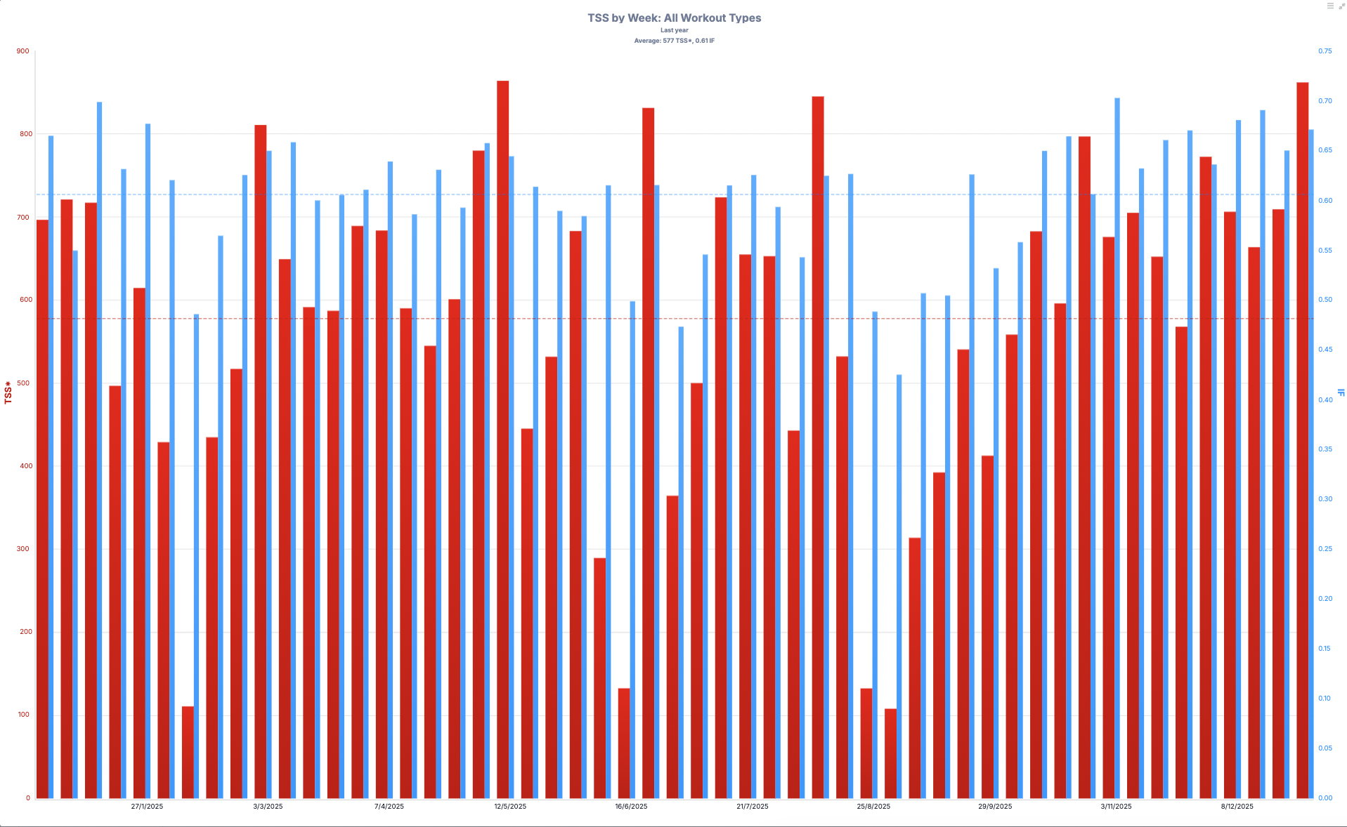 The Shift in “Ingredients”: While the total weekly TSS (red bars) remained somewhat similar throughout the year (except the sickness weeks), the composition of that stress changed. Later in the year, the IF became more standardized. By “putting the screws down” on unstructured high intensity and focusing on themed blocks (like cadence drills), Nellie was able to handle a higher overall load with better recovery.