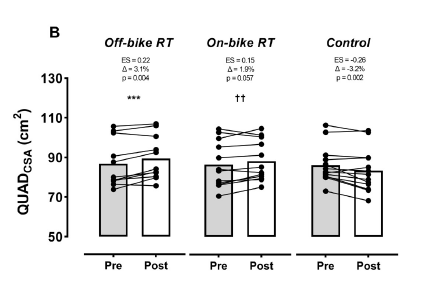 Muscle Cross-Sectional Area (CSA): Both groups saw quad growth, but it was only significant in the off-bike squat group (as seen in the figure below). While this might appeal to bodybuilders, a larger muscle cross-sectional area is not always desirable in an endurance sport like cycling.